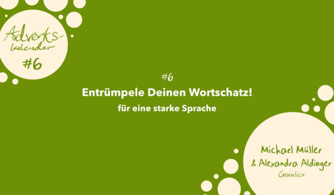 Genialico Adventskalender #6: Entrümpele Deinen Wortschatz – für eine starke Sprache!   Unser Ziel ist es, positiv, verständlich und höflich zu formulieren. Negative Formulierungen werden oft und gern benutzt, häufig ohne darüber nachzudenken. Diese sind missverständlich, unhöflich, demotivierend oder sogar ein Zeichen von Schwäche.    In diesem Beitrag schauen wir uns einzelne Worte an, die…