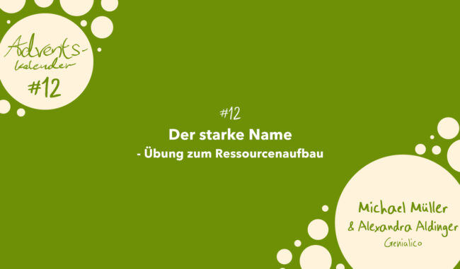 Genialico Adventskalender #12: Der starke Name   Diese Übung ist richtig toll, um Dir und anderen in Deinem Umfeld die eignen Ressourcen/Stärken immer wieder bewusst zu machen.   Anhand des Namens „Andrea“ lässt sich die Übung ganz leicht erklären:   A ufgeweckt N eugierig D ankbar R ücksichtsvoll E hrgeizig A uthentisch   So funktioniert die…