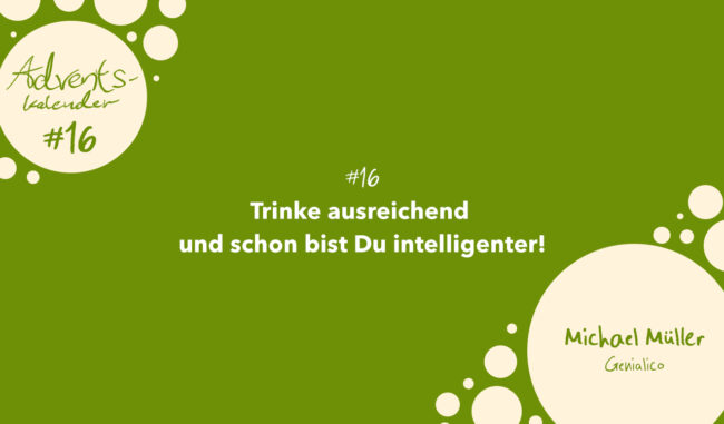 Genialico Adventskalender #16: Trinke ausreichend und schon bist Du intelligenter!   Der Mensch besteht zu 60 – 80 Prozent aus Wasser. In 24 Stunden rotieren etwa 2000 Liter an Körperflüssigkeit durch unseren Kopf. Das ist wahrlich eine riesige Menge! Zur Vereinfachung: das sind etwa 12 volle Badewannen.   Das zeigt wie wichtig es ist ausreichend…