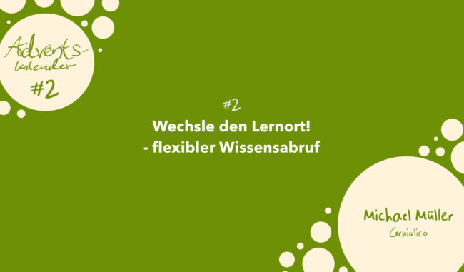 Genialico Adventskalender #2: Lernort wechseln – flexibler Wissensabruf Wer immer am gleichen Lernort lernt, etwa also am Schreibtisch im eigenen Zimmer, kann den Lernstoff genau an diesem Ort zumeist abrufen. Das geschieht dadurch, weil das Gehirn das zu Lernende mit dem Lernort zusammen abspeichert und verbindet. Häufig geschieht es dann, dass die*der Lernende das Gelernte an…