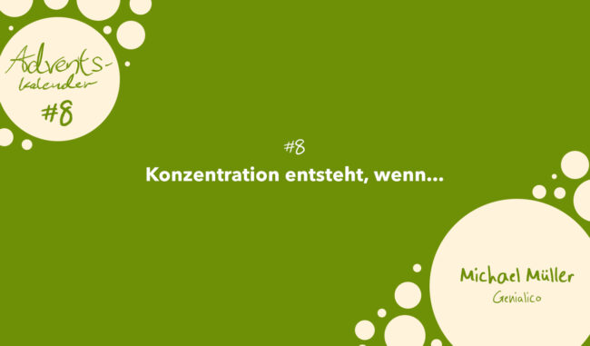 Genialico Adventskalender #8: Konzentration entsteht, wenn…   der Lernstoff sinnvoll ist. Also wenn der*die Lernende weiß, warum das zu Lernende hilfreich im täglichen und zukünftigen Leben ist. Wenn dies partout nicht gelingen sollte (manchmal ist der Sinn nicht zu erkennen…), dann ist es besonders wichtig, immer ein Ziel vor Augen zu haben (etwa die gute Note…