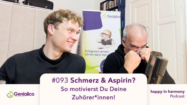 Schmerz & Aspirin? So motivierst Du Deine Zuhörer*innen! | „happy in harmony“-Podcast #093   Du hast bestimmt schon einmal erlebt, dass Du in einem Vortrag, einer Unterrichtsstunde oder einem Gespräch warst und nicht motiviert warst dabei zuzuhören. Wir zeigen Dir in dieser Episode wie Dir das bei Deinen eigenen Präsentationen und Gesprächen nicht passiert! Mit…
